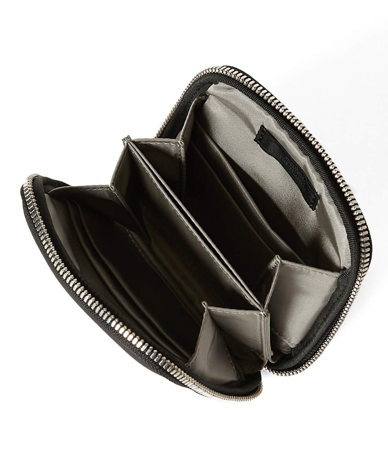 ファスナーの引き手はオリジナルで製作。両サイドにカードスロットを備え、中央には小銭や小物の収納に便利なポケットを配置。