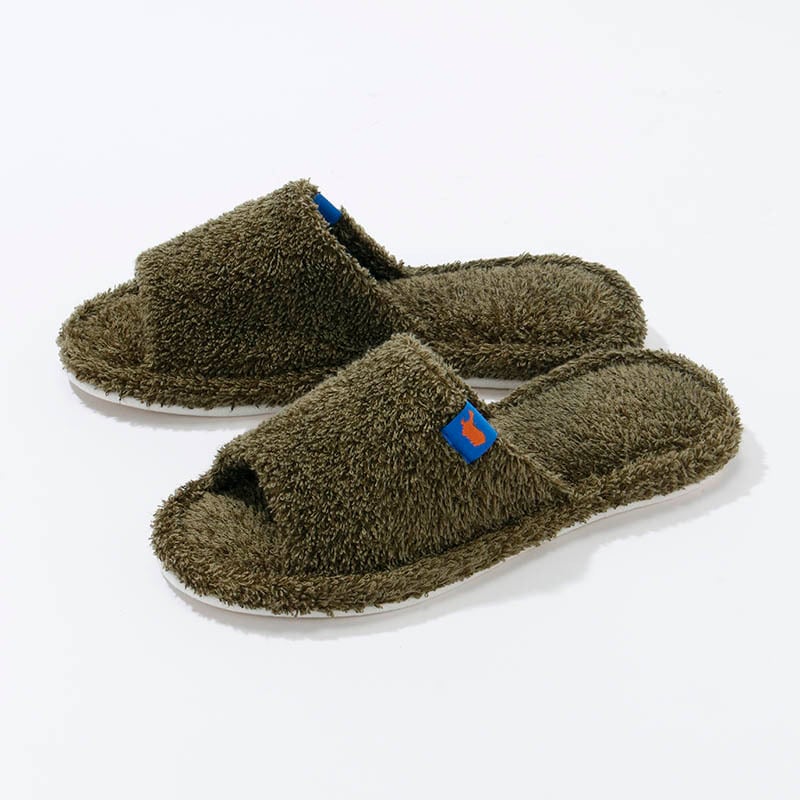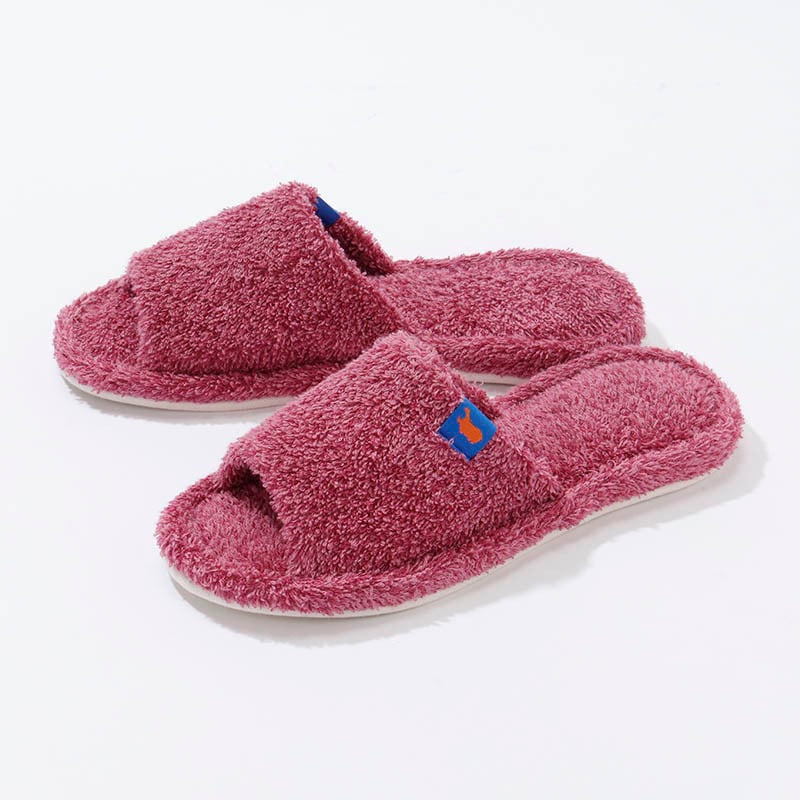 ヒポポタマスのタオルがもつ高い吸水性やふんわりとした肌触りを活かしたルームスリッパは、つま先部分が開いて空気やホコリが逃げていく仕様です。またアウトソール部分はコットン製で床材を傷める心配もありません。