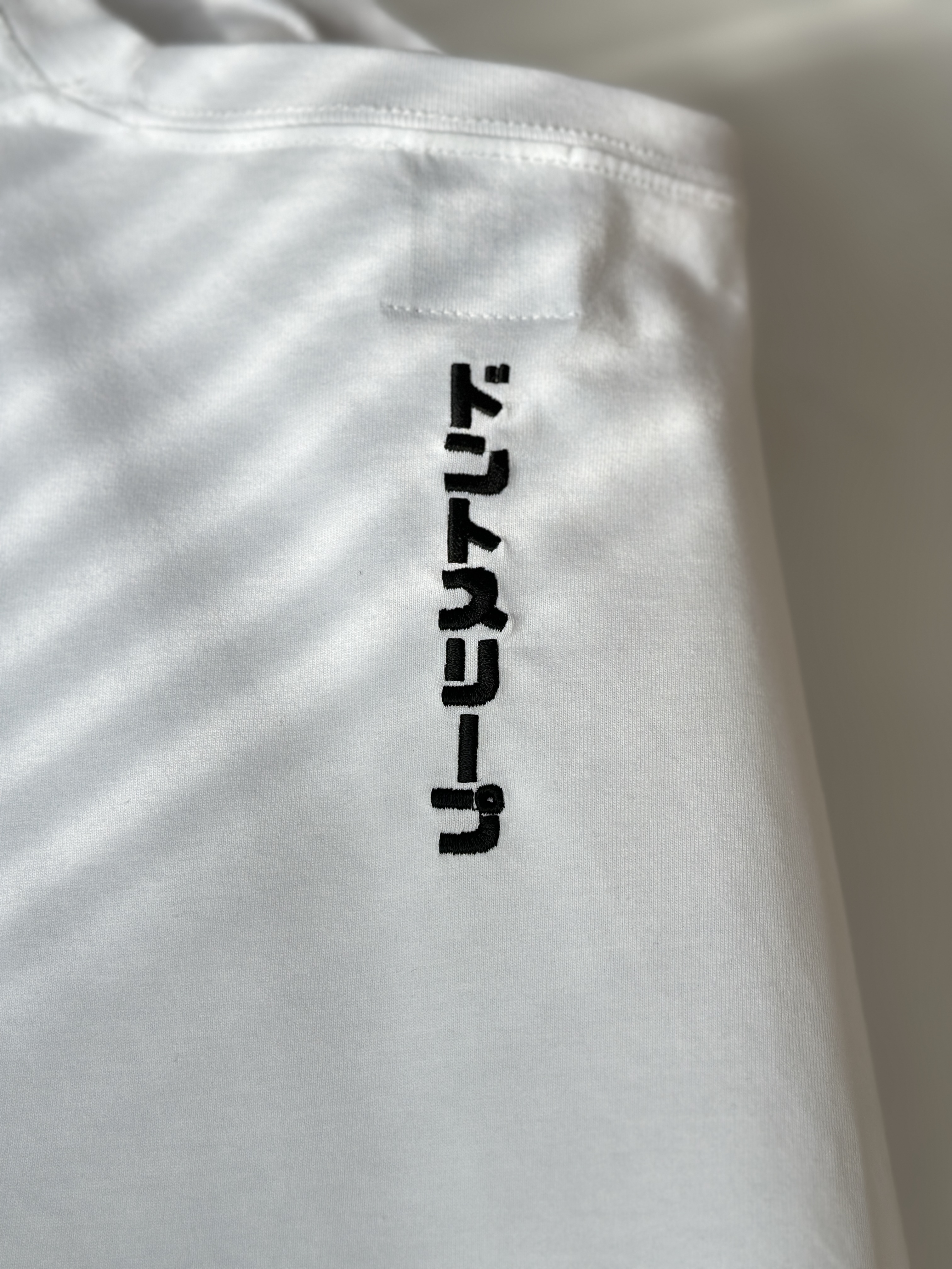 背面にはカタカナで「ドントスリープ」のメッセージを刺繍にて表現。