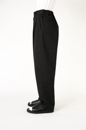 シルエットは、わたりに十分な分量を持たせつつ、裾に向かって緩やかに絞ったワイドテーパード。