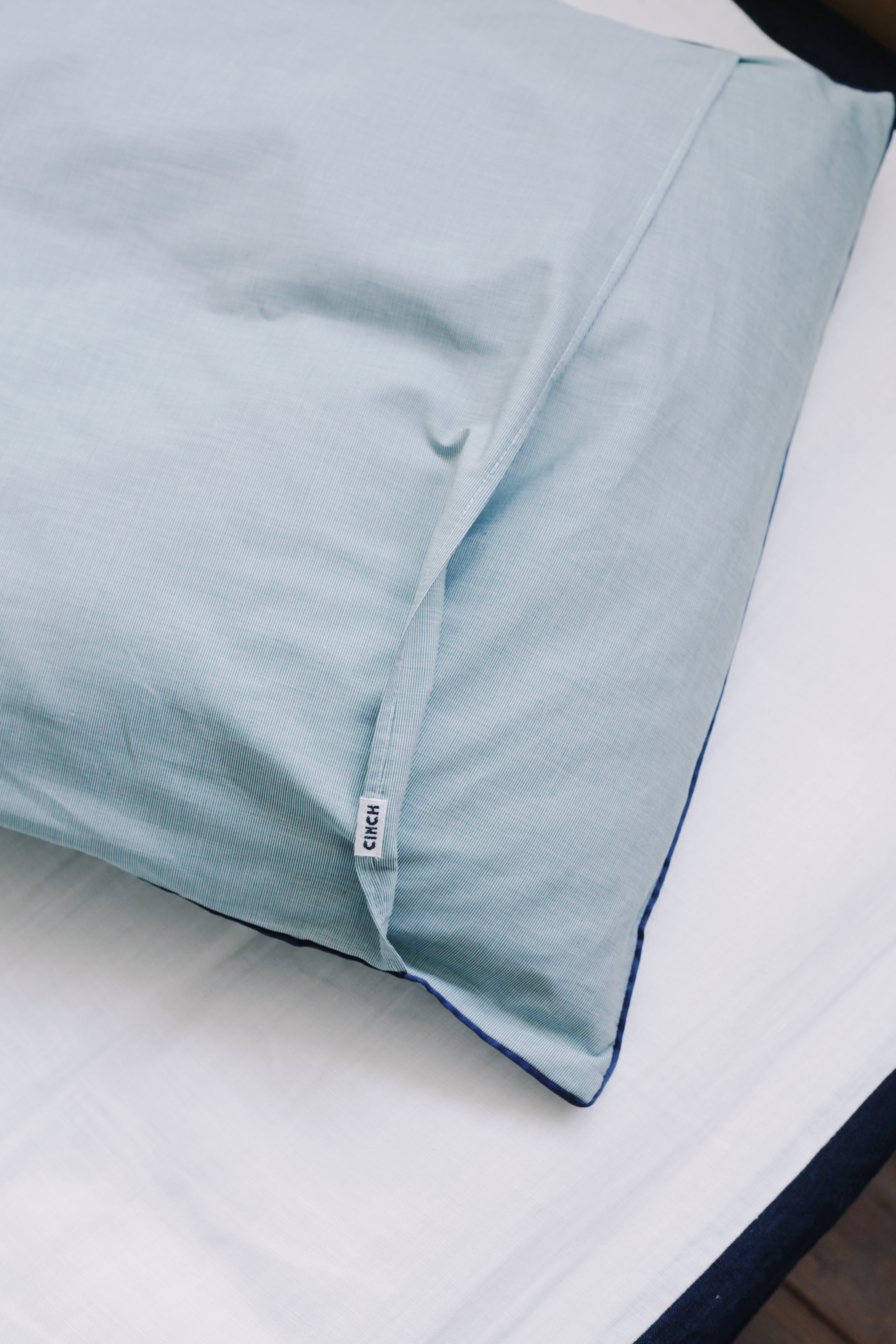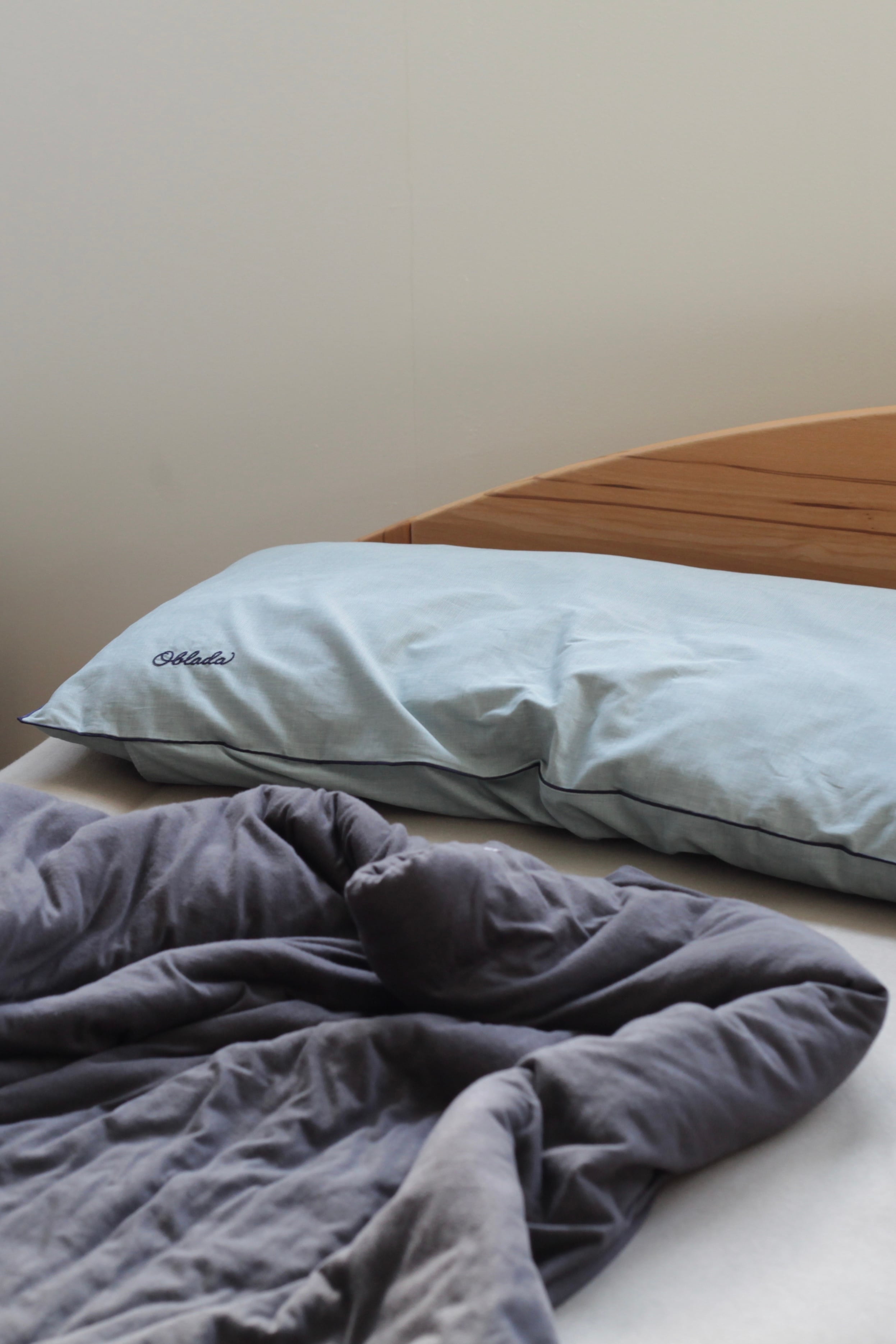 ネイビーの縁取りを効かせた上品なデザインが、寝室の空間にも自然と馴染みます。Obladaのロゴ刺繍もあしらい、枕としての使い心地はもちろん、インテリアとしても存在感のある仕上がりです。
