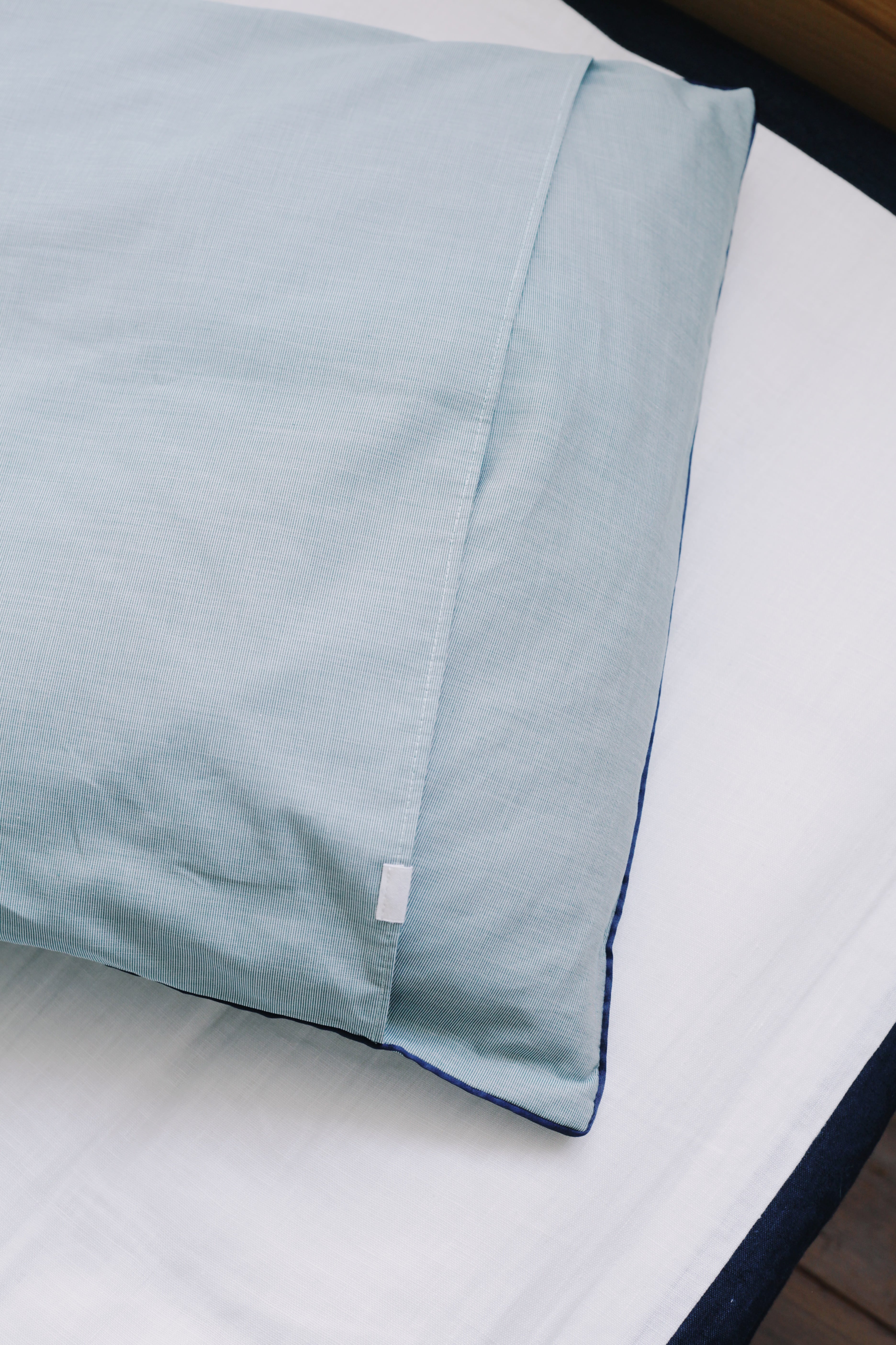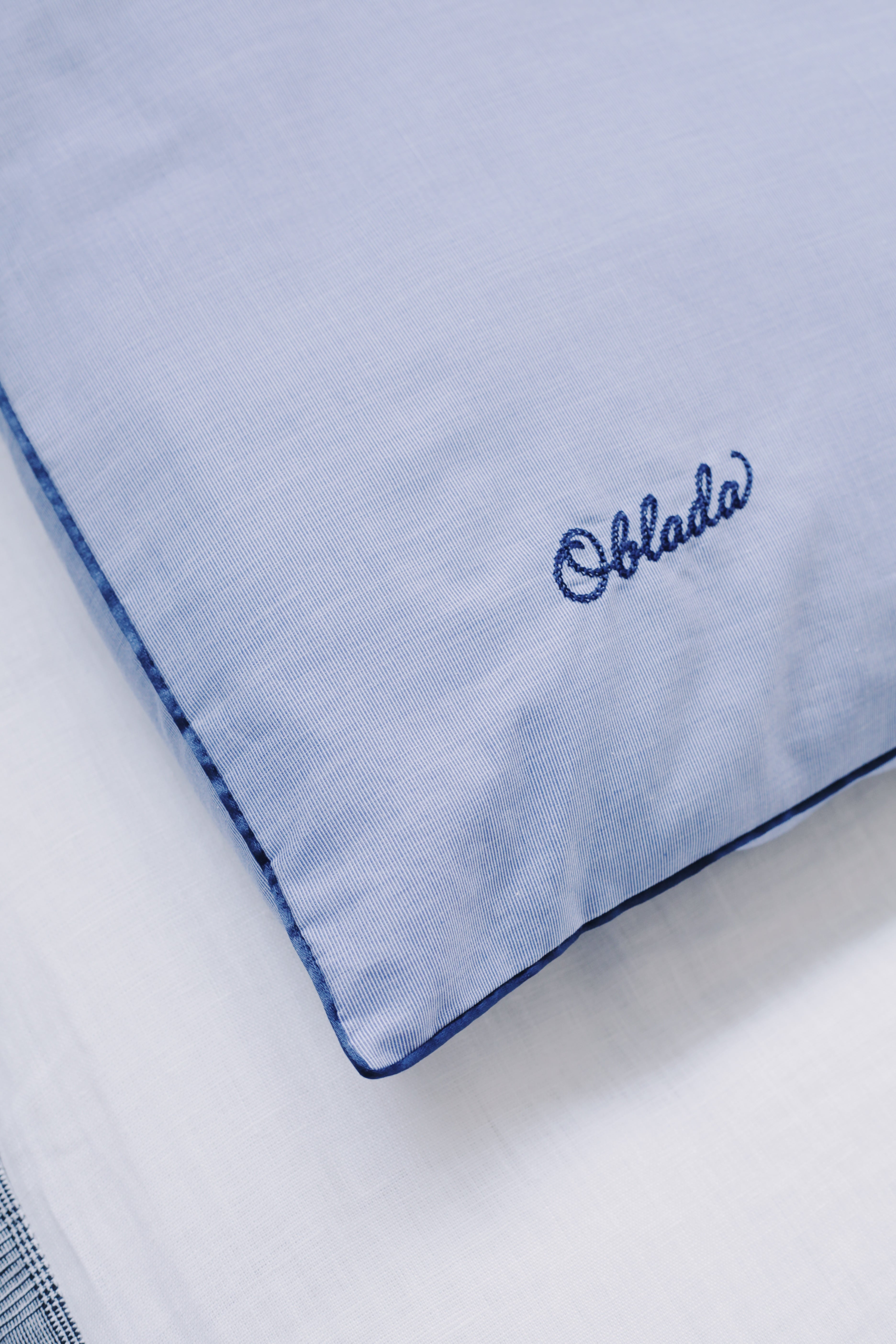 ネイビーの縁取りを効かせた上品なデザインが、寝室の空間にも自然と馴染みます。Obladaのロゴ刺繍もあしらい、枕としての使い心地はもちろん、インテリアとしても存在感のある仕上がりです。