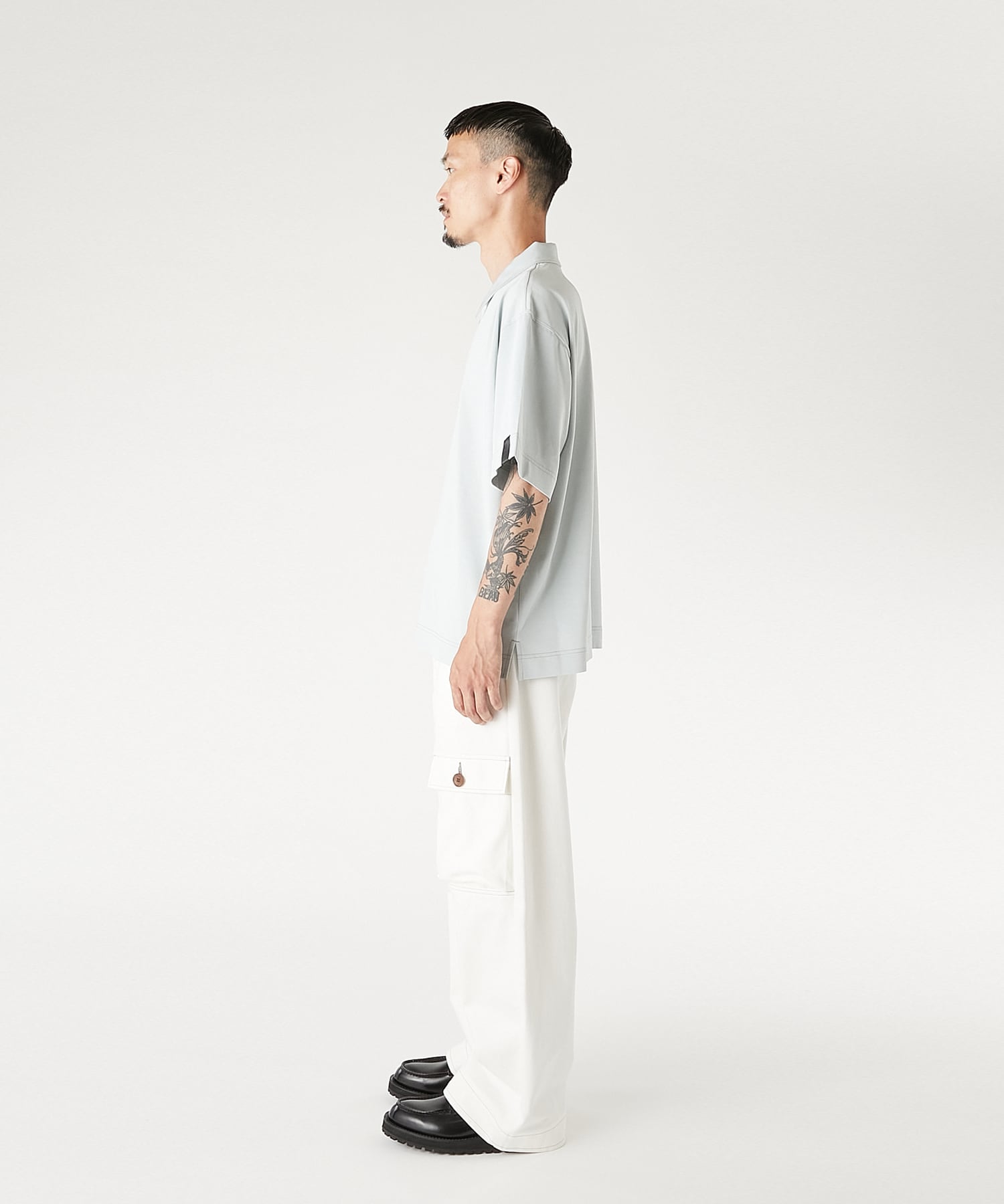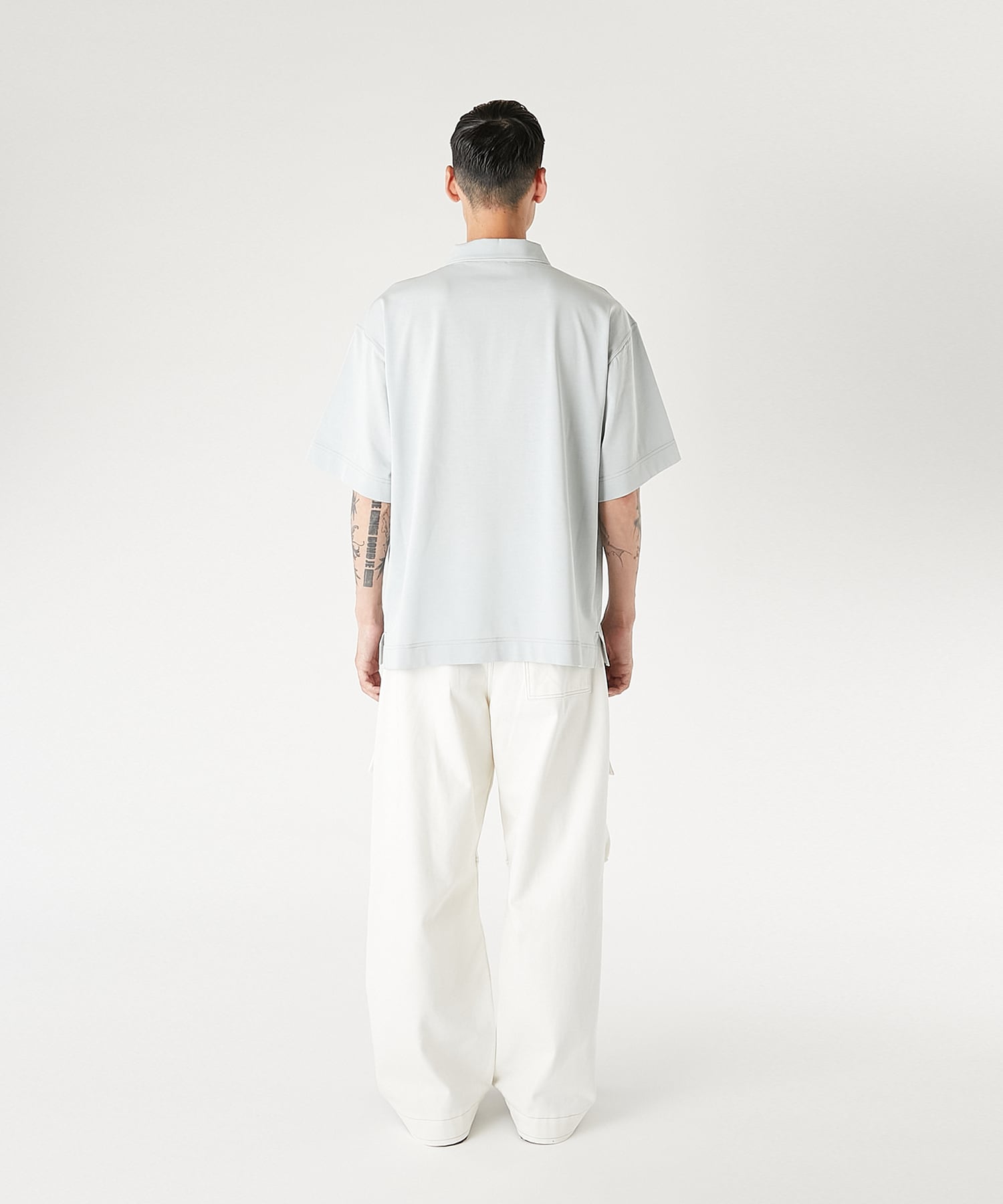 左袖には、N.HOOLYWOOD COMPILEを象徴するブラックのブランドネームを配置。BLACK以外のカラーには配色ステッチを施し、ミニマルな中に奥行きのある表情をプラス。